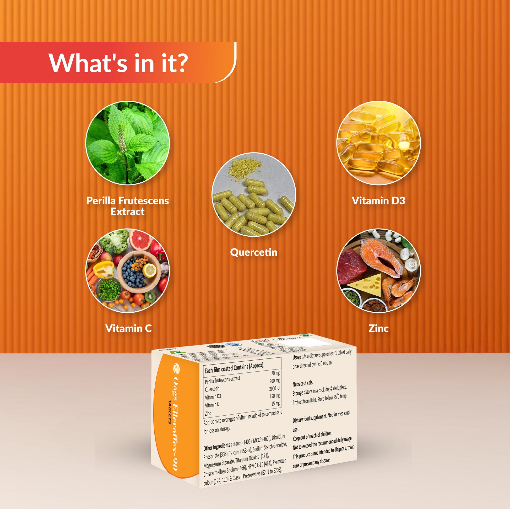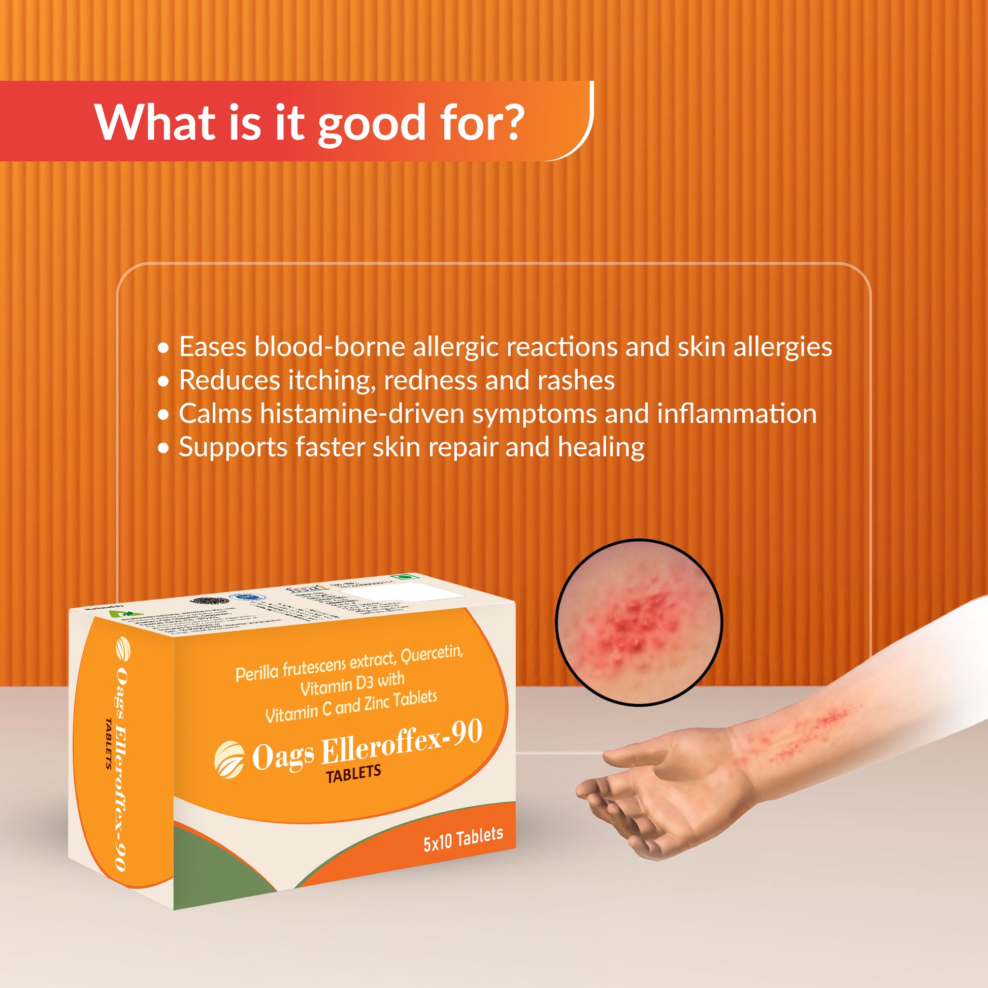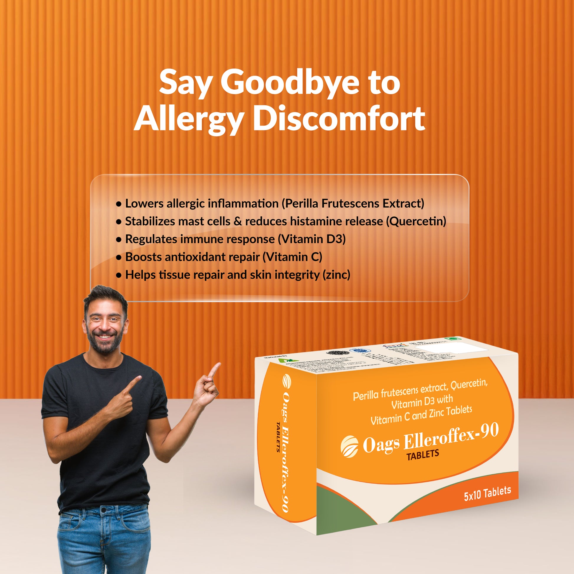 Oags Ellerofex-90 is a scientifically formulated anti-allergy supplement combining herbal extracts and immune-supporting nutrients. It helps reduce allergic reactions, improves respiratory comfort, and supports skin health.