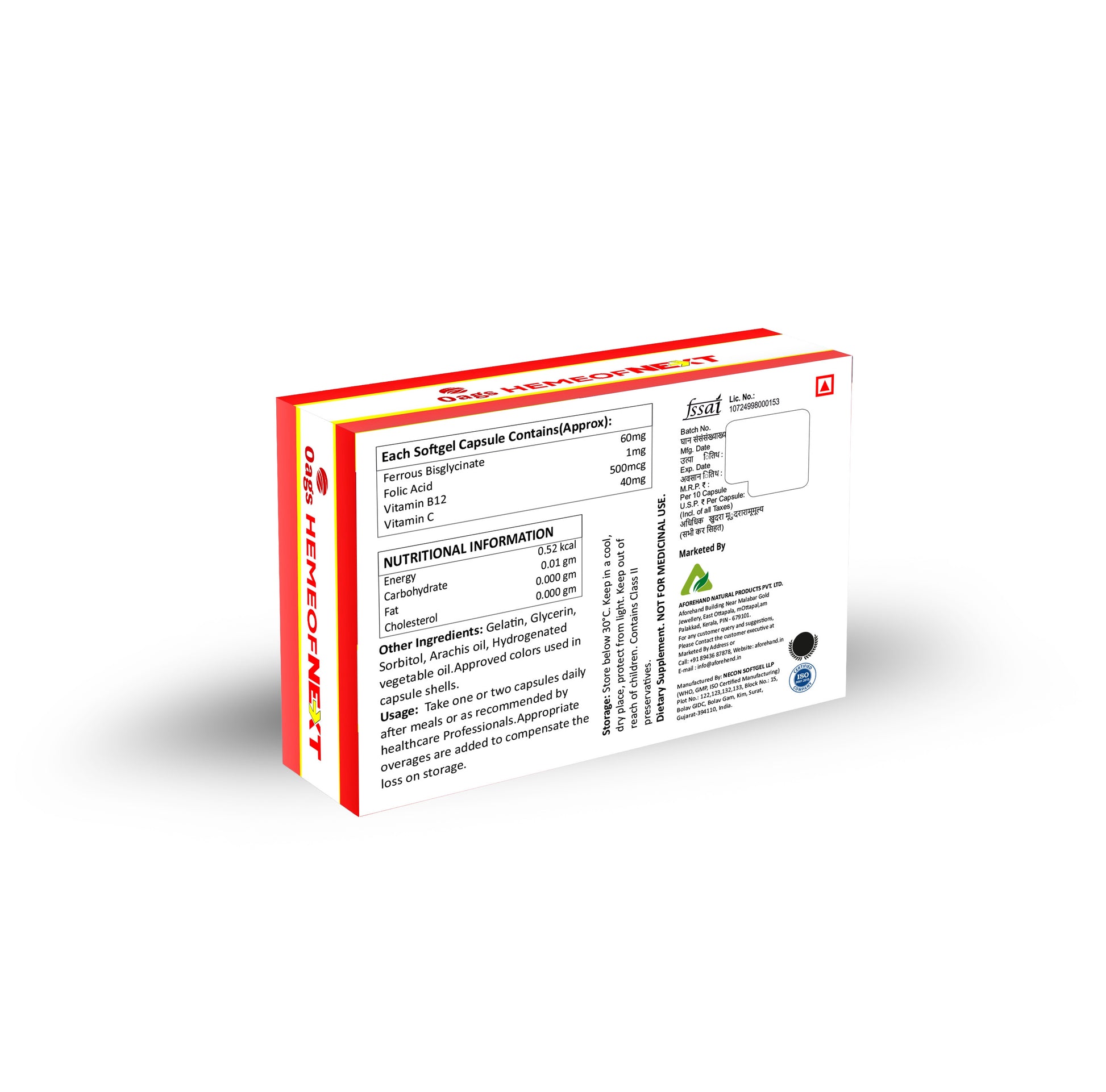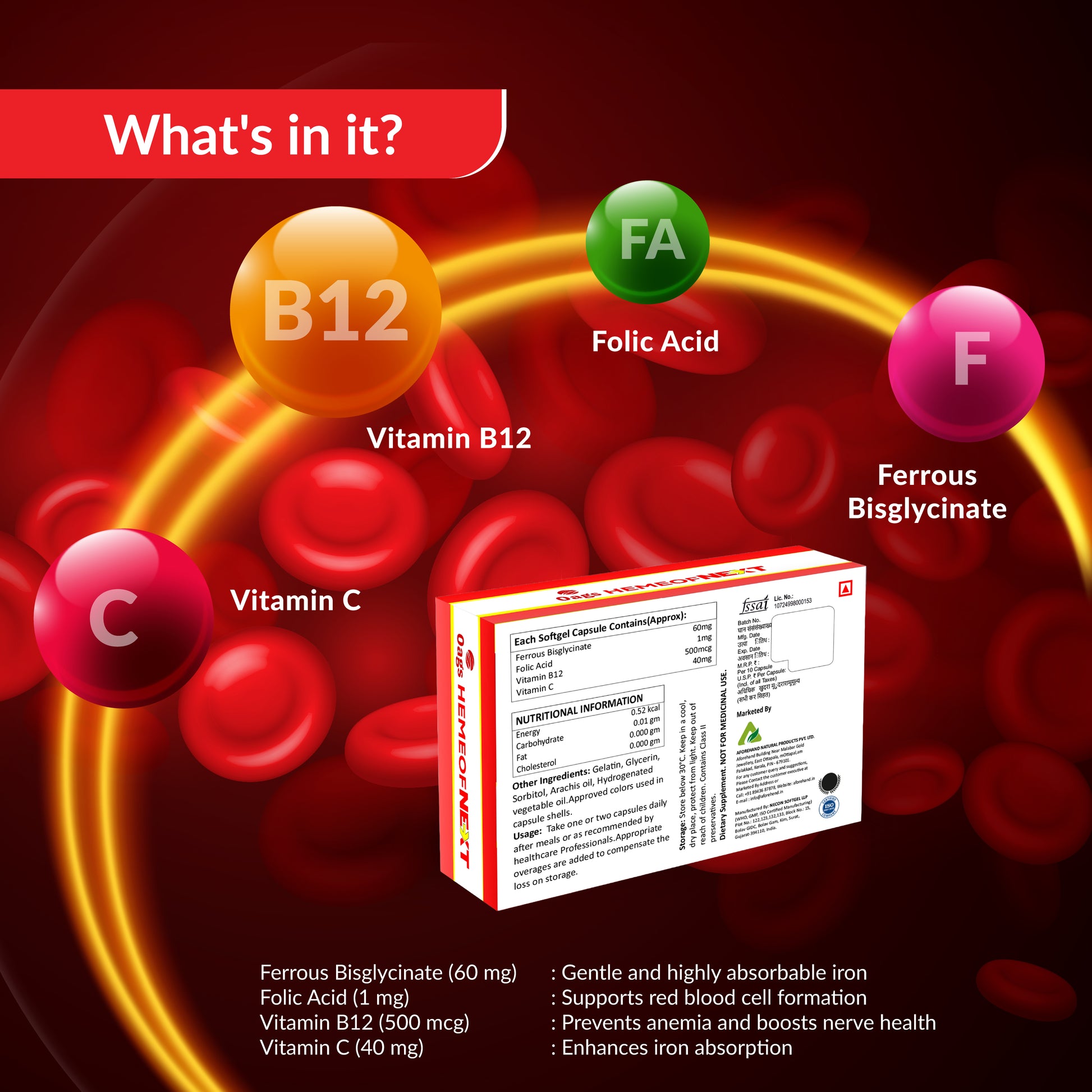 OAGS HEMEOFNEXT is a premium iron, folate, and B-vitamin formulation designed to support healthy red blood cell formation, improve hemoglobin levels, and enhance overall vitality. It helps prevent anemia, boosts energy, and supports nerve and immune health.